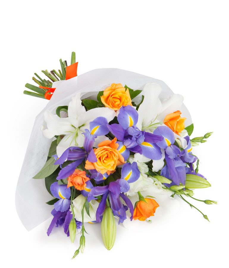 Hand tied bouquet wrapped, irises, lilies, lisianthus, roses perfectly arranged by our local florists in Italy. We can deliver this bouquet and many others nationwide in Italy.