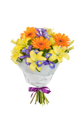 Yellow Lilies, Orange Gerberas and Purple Iris, Giuseppina is full of life and laughter. Flower delivery in Italy.